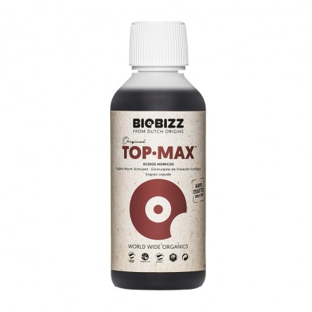 Top-Max estimula la reproduccion celular durante la fase de floracion, acelera el transporte de azucares a las flores y frutos obteniendo resultados exuberantes en cosecha (tamaño y peso) aportando un sabor dulce en el producto final. Contiene acidos humicos y fulvicos que se encargan de la aceleracion en el transporte de nutrientes y un crecimiento floral saludable.