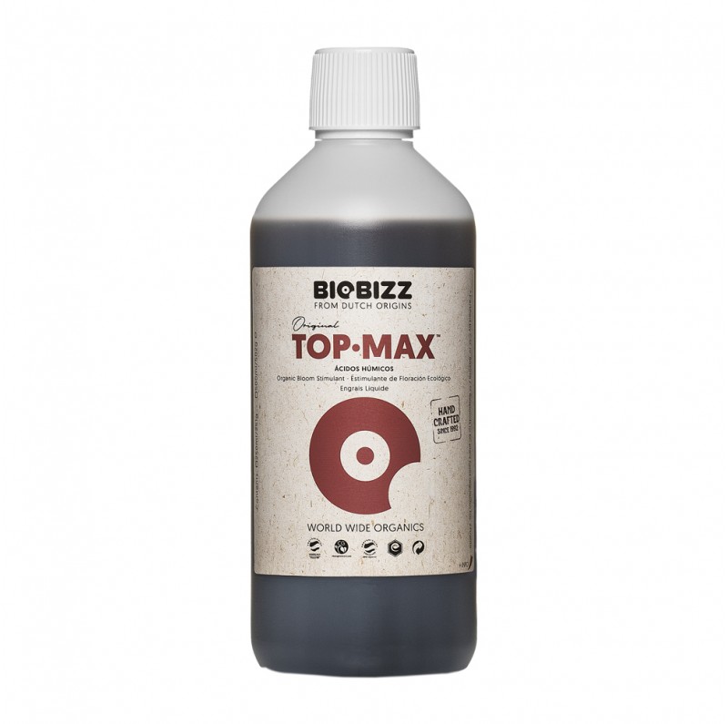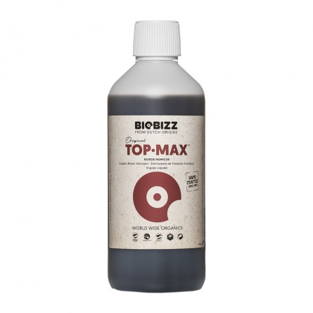 Top-Max estimula la reproduccion celular durante la fase de floracion, acelera el transporte de azucares a las flores y frutos obteniendo resultados exuberantes en cosecha (tamaño y peso) aportando un sabor dulce en el producto final. Contiene acidos humicos y fulvicos que se encargan de la aceleracion en el transporte de nutrientes y un crecimiento floral saludable.